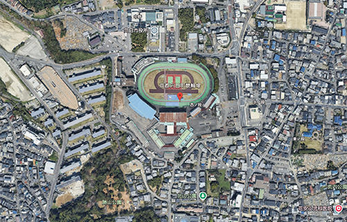 上空から見た向日市。中央にある楕円が競輪場、その周囲をたくさんの住宅が囲んでいるのがわかる。