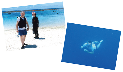 生まれ育ったのが小さな漁村だったこともあり、趣味は、足ヒレやシュノーケルをつけない素潜りです。左の写真は、2025年夏、南西諸島方面に妻と出かけた時です。右は、数年前、パラオ北部のとあるドロップオフです。「潜れる限りは弁護士としての活動もできるかな」と思っています。