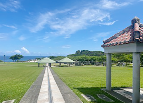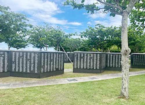 資料館の次に、「平和の礎」に参拝しました。眼前に空と海が広がる広場を中心に、刻銘碑が屏風状に並んだ風景は、資料館の惨状の記録とはかけ離れたような美しい空間でした。「平和の礎」は、国籍所属を問わず、すべての戦没者を弔うために建立されたもので、令和6年度時点では24万2567人のお名前が刻まれています。