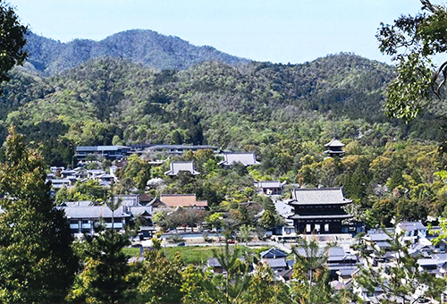 双ヶ丘の一ノ丘より仁和寺を望む遠景(手前緑地帯がホテル建設地)
